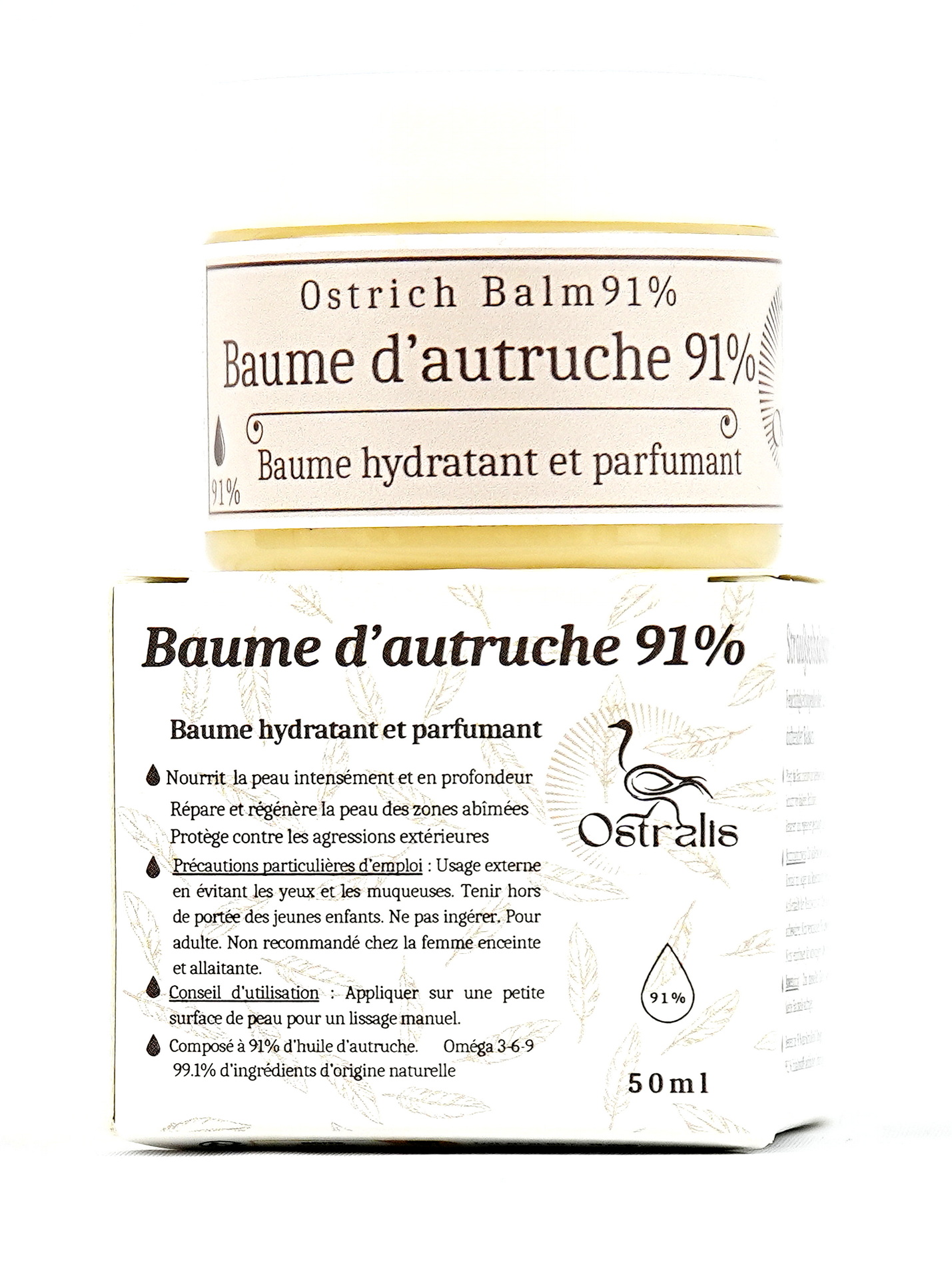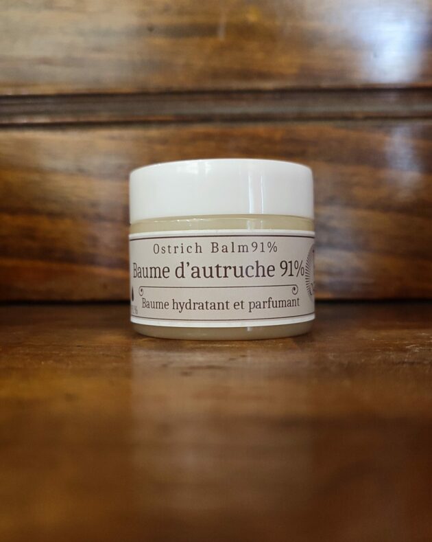 Baume hydratant et parfumant composée à 91% d’huile d’autruche (oméga 3-6-9).